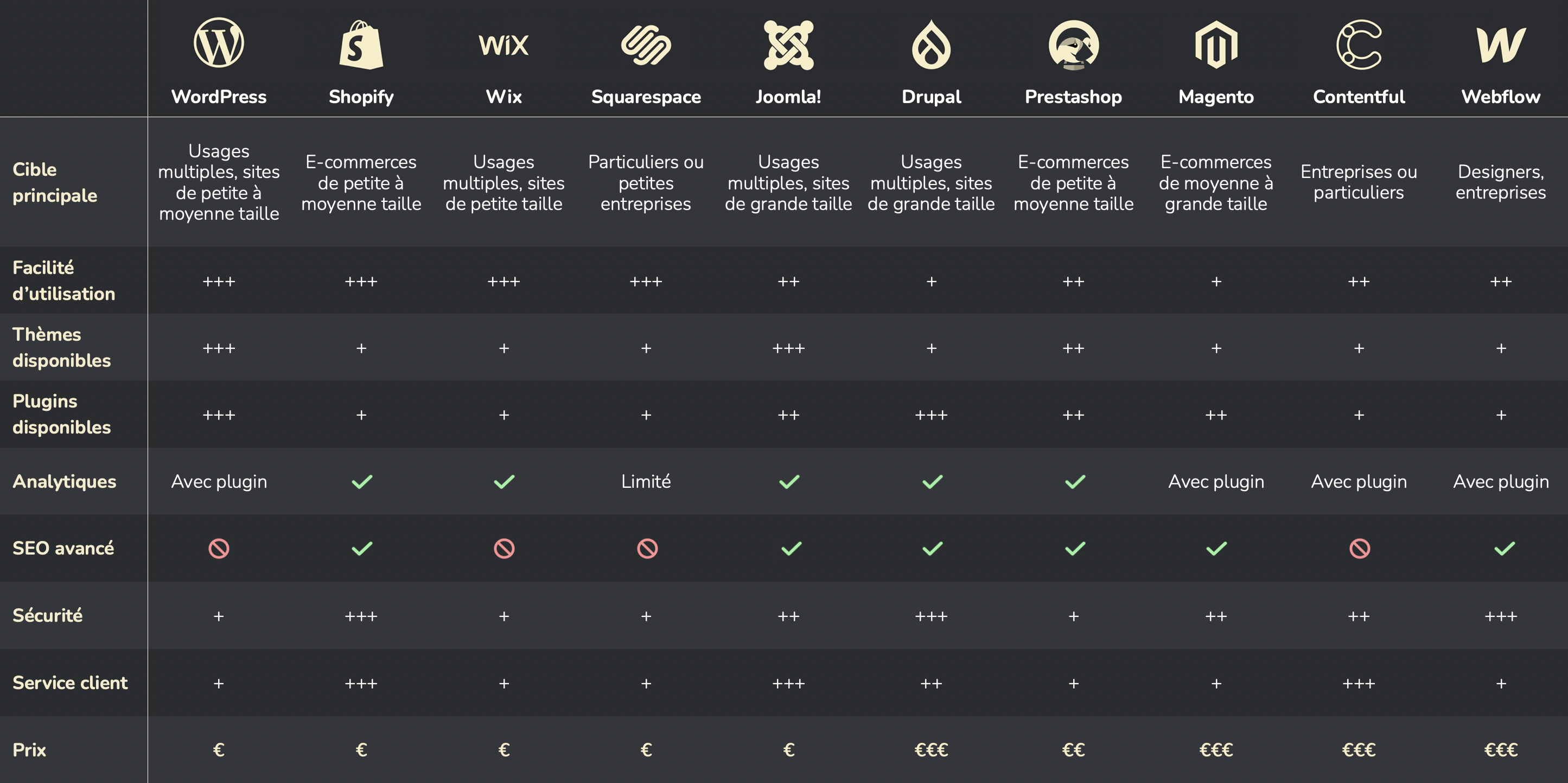 WordPress étant la solution choisie par mon entreprise, je focaliserai ma veille technologique sur les CMS et constructeurs de sites. J’ai pour cela choisi de comparer 10 des CMS les plus populaires, à savoir WordPress, Shopify, Wix, Squarespace, Joomla!, Drupal, Prestashop, Magento (Adobe Commerce), Contentful et Webflow.